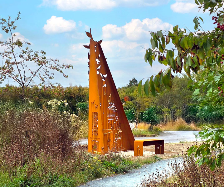 The sculpture is made from Corten steel — that warm, rust-toned metal that changes with time and weather. It symbolises both the permanence of the trail and the ever-shifting rhythms of the natural world. Birds rise in flight across its surface, joined by human figures in motion, echoing the rhythms of footfall and wingbeat.