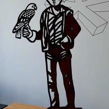The artwork is inspired by Billy’s passion for flying Kes (Billy’s name for the bird) it represents the moment of freedom for both of them when Billy swings his lure and Kes soars and swoops, a perfect metaphor for freedom and refuge from a life of neglect and abuse . These moments are described as being in a ‘pocket of silence’, the coloured circle represents being in their own world where no one can hurt them.