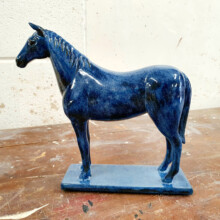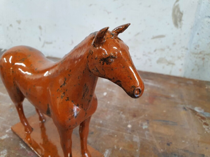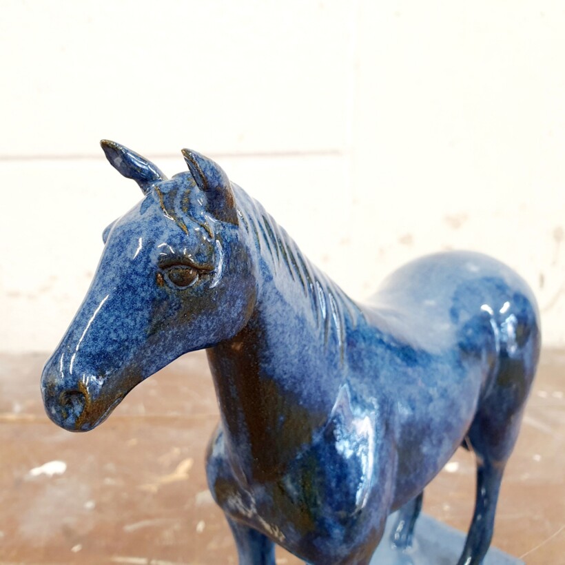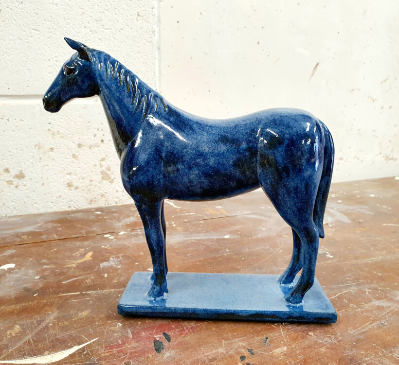 I plan to release a batch of 10 ceramic horses every month starting in January 2022. Each is handmade in my studio and takes approximately one month from start to finish to make, then allow to dry, fire to bisque (which means firing in a kiln once to remove all water from the clay) then to glaze in the appropriate colour, fire a second time at a higher temperature to bond the clay and glaze together. Then photograph and upload for sale.