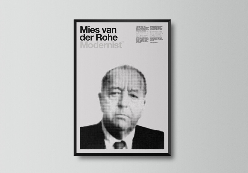 The first of a regular series of prints celebrating pioneers in international modernism. Our first features Mies van der Rohe widely acknowledged as one of the twentieth century’s greatest architects. He was a pivotal figure in modern architecture drawing together open space and highlighting and exposing the construction materials as a critical design feature.