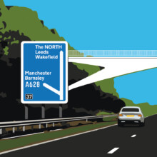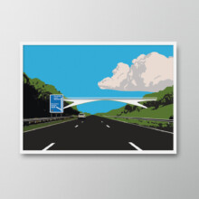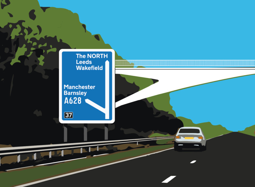 In 1959 the M1 motorway opened in Britain. It heralded the exciting prospect of travelling across the country with ease and a new age of modernism dawned. The M1 is a perfect example of good design and engineering, Sir Owen Williams designed the road system and Jock Kinneir and Margaret Calvert designed the motorway road sign system and typefaces Transport and Motorway. This bridge is located on Junction 37 and is one of my favourite bridges on the whole of the M1, personally it also is the turn off when driving home.