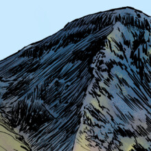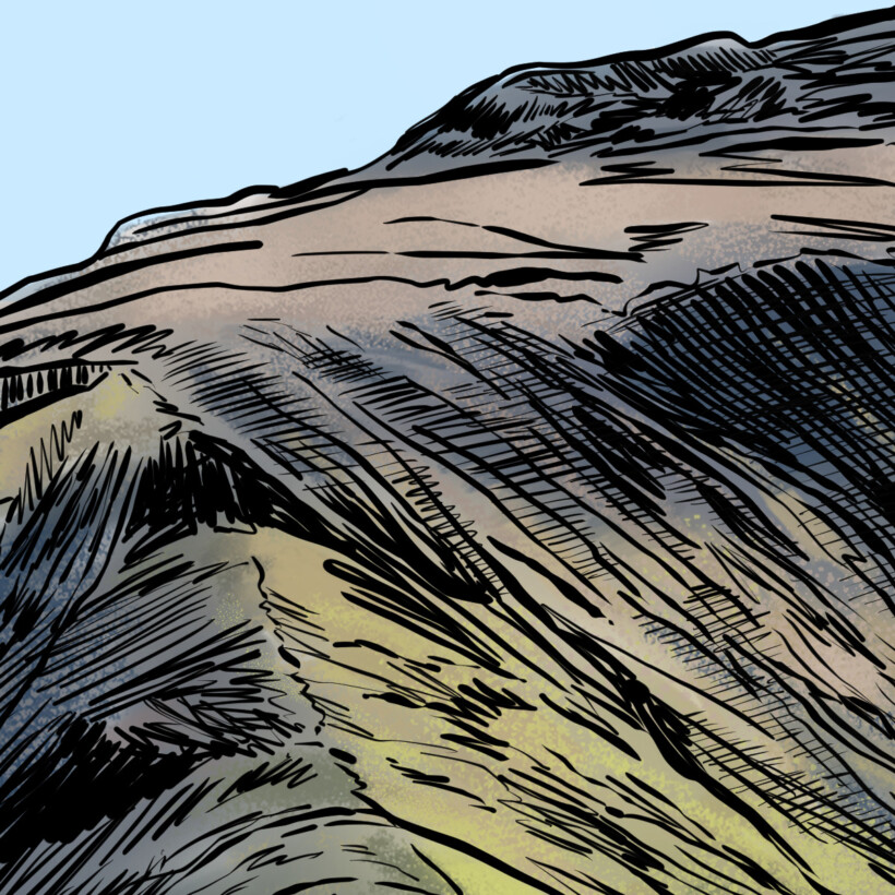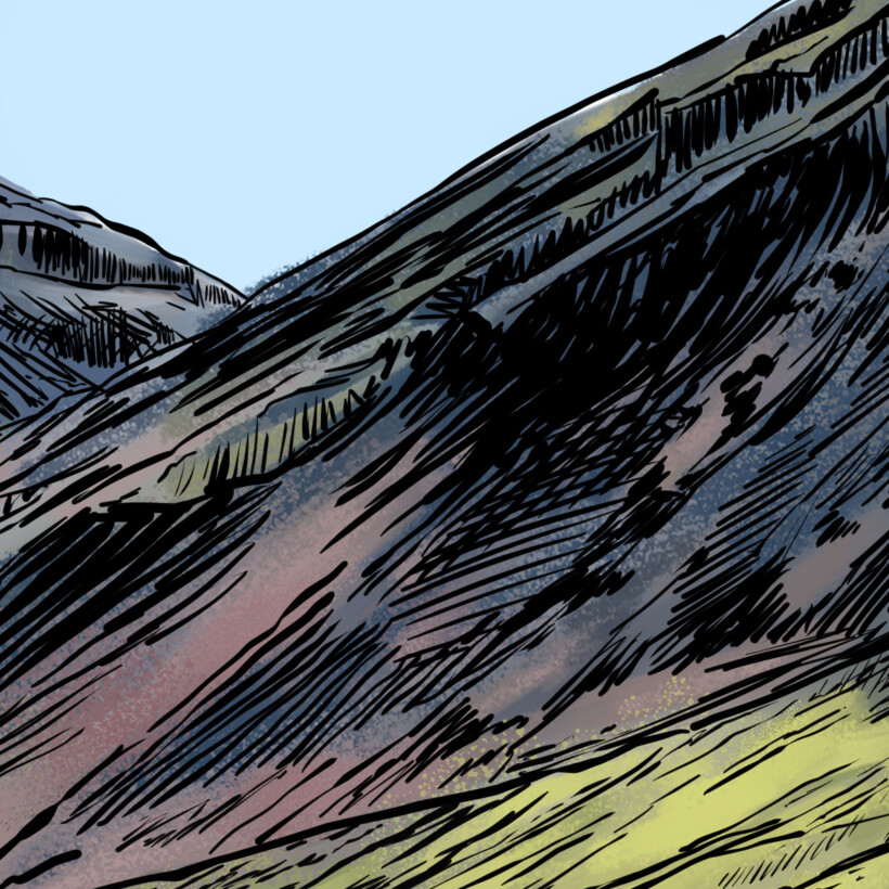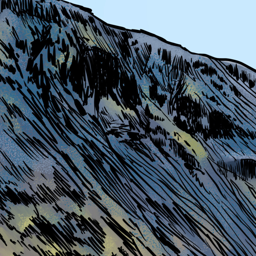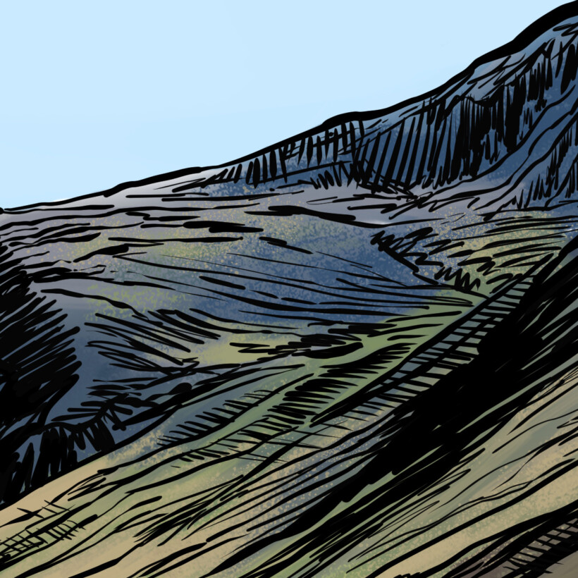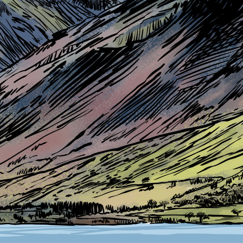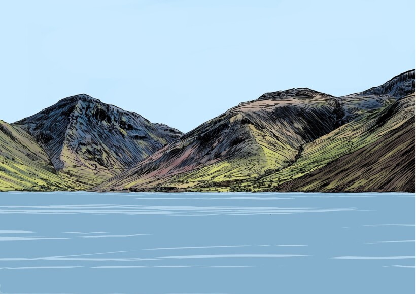 This view over Wastwater towards Great Gable in the Lake District was created combining a few viewpoints to create a panoramic sweep. The process of creating this was the perfect opportunity to really engage and enjoy the act of drawing and the realising of details such as the trees and fields as the sun shines across them. The color application is quite painterly and as the detail images show (below) the application suites the landscape perfectly.